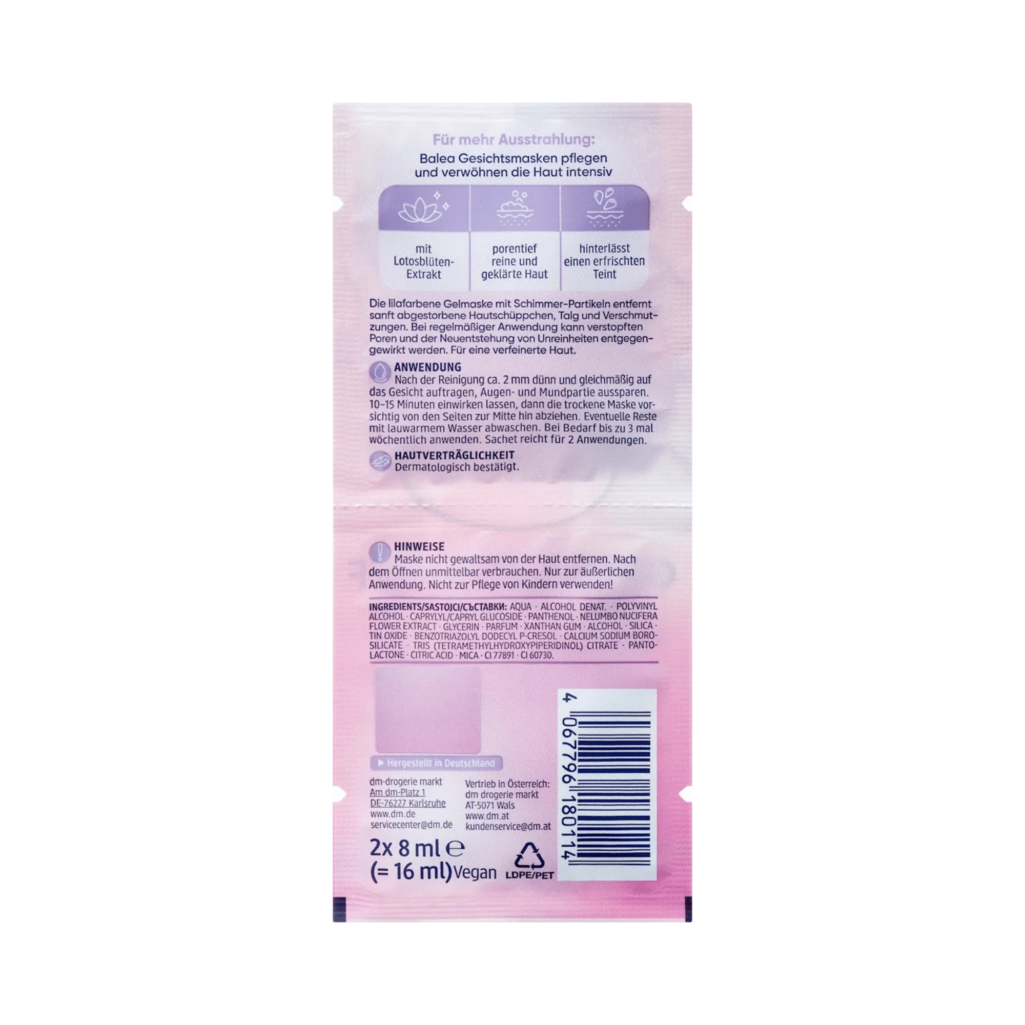 Reveal refreshed, radiant skin with the Balea Glow Peel-Off Mask. Infused with Lotus Flower Extract and shimmer particles, this vegan mask deeply cleanses, removes impurities, and refines the skin’s texture for a smooth, revitalized appearance. Perfect for an indulgent skincare routine, it leaves your face refreshed and glowing. Ideal for all skin types seeking a deep cleanse and a luminous finish.