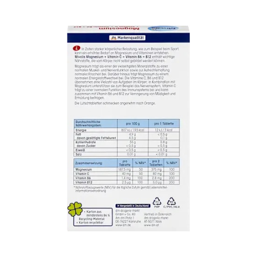 Mivolis Magnesium + Vitamin C + Vitamin B6 + B12 Lozenges provide essential minerals and vitamins in a pleasant orange-flavoured lozenge, ideal for everyday use and especially during periods of physical exertion, stress, or sport.