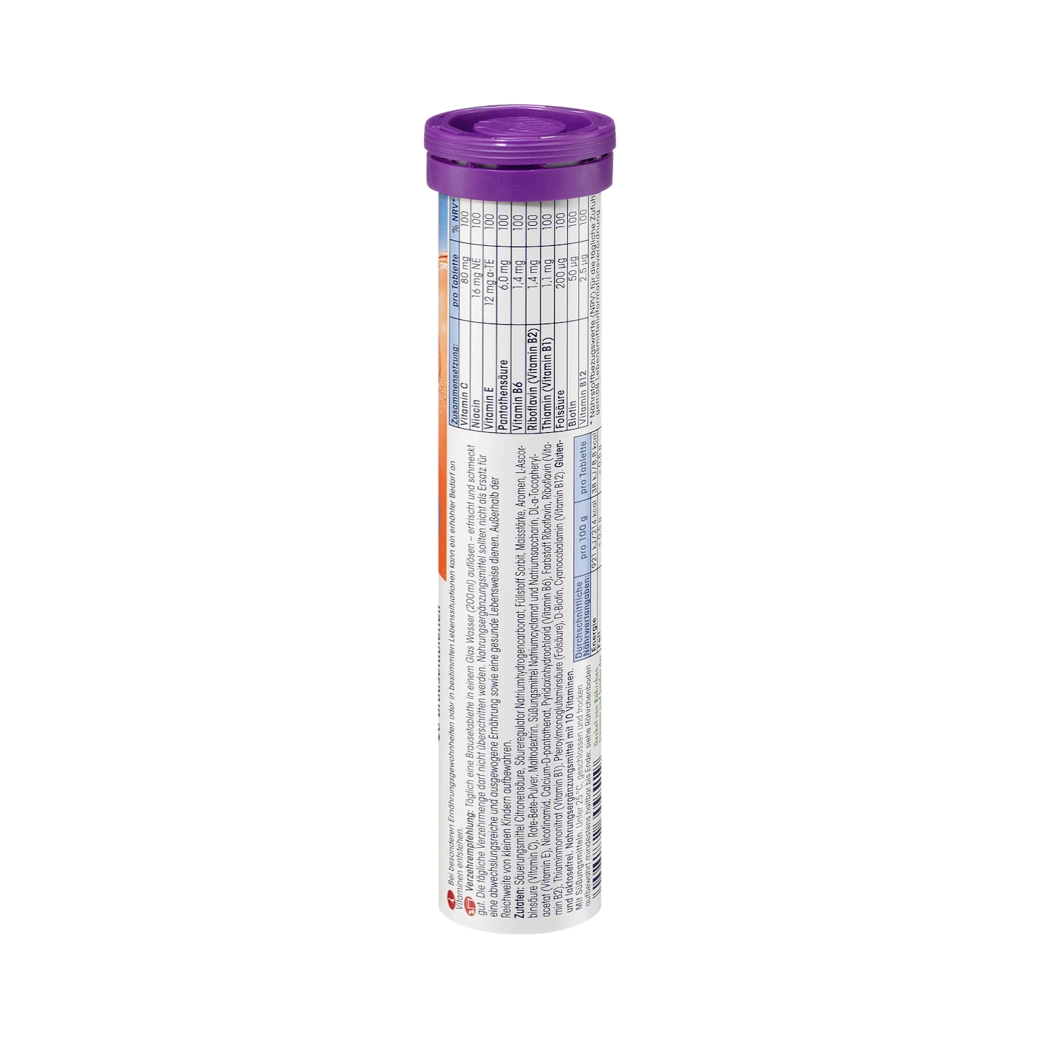 Citric Acid (acidifier), Sodium Hydrogen Carbonate (acidity regulator), Sorbitol (sweetener), Corn Starch, Flavorings, L-Ascorbic Acid (Vitamin C), Beetroot Powder, Sweeteners (Sodium Cyclamate, Saccharin Sodium), DL-Alpha-Tocopheryl Acetate (Vitamin E), Nicotinamide, Calcium D-Pantothenate, Pyridoxine Hydrochloride (Vitamin B6), Riboflavin (Vitamin B2, colorant), Thiamine Mononitrate (Vitamin B1), Pteroylmonoglutamic Acid (Folic Acid), D-Biotin, Cyanocobalamin (Vitamin B12).